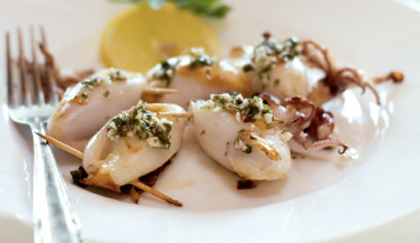 Pulite e lavate i calamari staccando i tentacoli e triturateli finemente. In un’ampia padella fate rosolare i tentacoli tritati con un cucchiaio di olio e uno spicchio di aglio e, verso fine cottura, sfumate con il vino. Mettete la mollica del pane ad ammorbidirsi nel latte e quando si sarà impregnata, strizzatela bene e aggiungetela ai tentacoli in padella, facendo saltare tutto insieme per alcuni minuti. Lasciate raffreddare e trasferiteli quindi in una terrina in cui aggiungerete ilformaggio, le uova, i pomodori secchi tritati, i capperi sciacquati e tritati e leolive snocciolate e triturate. Amalgamate bene il composto e aggiustatelo quindi di sale e pepe: aiutatevi con una sac a poche a riempire i calamari. Chiudete icalamari con uno stuzzicadenti e fateli rosolare in una padella con un filo di olio, due spichi di aglio: sfumate quindi con un bicchiere di vino bianco.